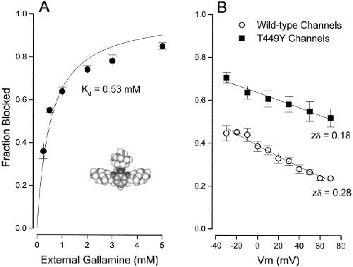Figure 7. External gallamine block of Shaker K channels. (A) Block of Shaker channels (at 0 mV) by the indicated external gallamine concentration. (Solid line) Fit of to the data with the indicated value of the dissociation constant. Mean and SEM limits from three to five measurements, except as indicated. (Inset) Space-filling model of gallamine. (B) Voltage dependence of channel block by external gallamine. Block of wild-type (○) and T449Y (▪) channels by 0.25 mM external gallamine at the indicated membrane voltages. Lines are fits of to these data with the indicated values of zδ. |