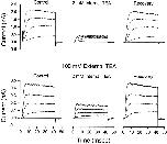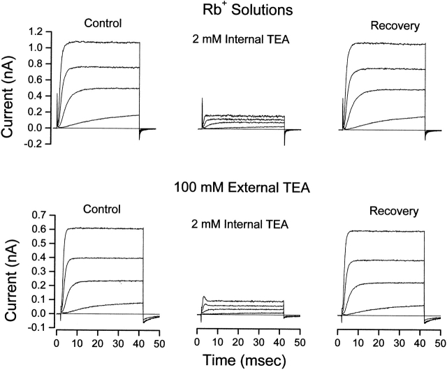 Figure 4. Lack of interaction between internal and external TEA in the presence of Rb+ ions. (Top) Shaker channel currents at several voltages before, during, and after recovery from application of 2 mM internal TEA with no TEA in the external solution. (Bottom) Currents from another patch before, during, and after recovery from application of 2 mM internal TEA with 100 mM TEA in the external solution. Currents elicited with 40-ms steps to voltages of −30, −10, +10, and +30 mV. Currents measured in K+-free, Rb+ solutions as described in methods. |
