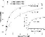 Figure 9. Interaction between external TEA and internal K+ ions. (Inset) Currents (at 0 mV) recorded with 135 mM (left) and 20 mM (right) internal K+ in the absence (larger current) and presence of 25 mM external TEA. (Main figure) Channel block (at 0 mV) at the indicated concentrations of external TEA in 135 mM (•) and 20 mM (□) internal K+. Block by 25 mM TEA was measured (▴) with 20 mM internal K+ and a nominally 0 K+ external solution (see methods). |