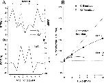 Figure 11. Simulation of apparent antagonism between external and internal TEA. (A, left ordinate) Rate constant representation (RCR, see methods) for (top) K+ (solid line) and Rb+ (dashed line) permeation of the model pore and for TEA block of the pore (bottom). (Right ordinate) Transition energies for the model using a frequency factor of 3 × 1011 s−1. The barrier heights would be three RT larger if the Eyring frequency factor (5.8 × 1012) were used. See text for details. The external solution is on the left side of the energy profiles. (B) Simulation of the apparent Kd for block by internal TEA as a function of the external TEA concentration with the K+ and Rb+ rate constants from A. Solid lines are fits of with the indicated values of Q for simulations with K+ (▪) and Rb+ (○) rate constants. In these simulations, external and internal ion concentrations were 10 and 150 mM, respectively. The size of the simulated current at 0 mV with the K+ ion rate constants was near 1 pA. |