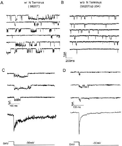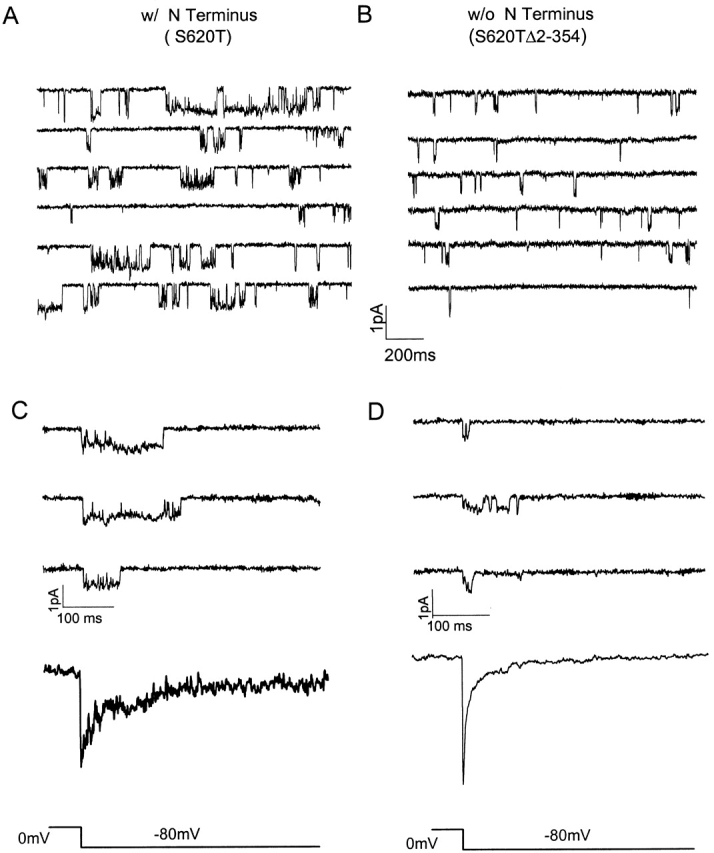 Figure 5. Single-channel activities at negative (repolarizing) potentials display longer open times when the amino terminus is present. During a continuous voltage command of −80 mV, lasting for 3−5 min, single-channel activities were recorded in cell-attached patch with 100 mM potassium in the pipette. Representative segments of the records from S620T and S620TΔ2-354 channels are shown in A and B, with longer openings apparent in S620T channels (n = 3 for each construct). (C and D) Ensemble tail currents and representative single trials of activities from which the ensemble averages were constructed for S620T and S620TΔ2-354 channels, respectively, during a 2-s repolarizing command to −80 mV after depolarization to 60 mV. Deactivation of the ensemble currents displays typical slow phenotype for S620T channel and fast phenotype for S620TΔ2-354 channels (n = 3 for each construct).
