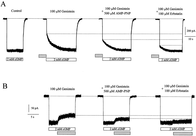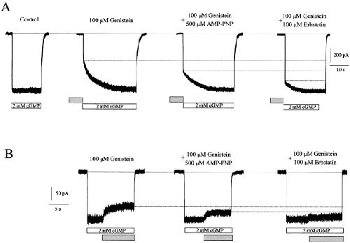 Figure 2. PTK inhibitors reduce the genistein inhibition. (A) Inhibition of closed rod photoreceptor CNG channels by 1 min pre-exposure to 100 μM genistein alone or together with PTK inhibitors (500 μM AMP-PNP or 100 μM erbstatin). Closed channels were activated by application of 2 mM cGMP (control). (B) Inhibition of fully activated channels by genistein alone or together with PTK inhibitors.