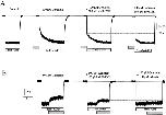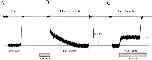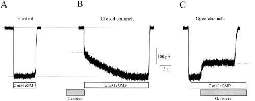 Figure 1. Effect of genistein on native rod CNG channels. (A) Activation of CNG channels by saturating cGMP without genistein. (B) Effect of genistein on closed channels. Response to saturating cGMP after pre-exposure to 100 μM genistein for 1 min. The broken line distinguishes the slowly activating current component inhibited by genistein and the rapidly activating residual current. (C) Effect of 100 μM genistein on fully activated channels, indicated by the broken line.