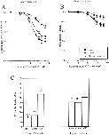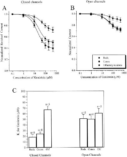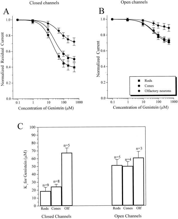 Figure 3. Comparison of genistein inhibition of native CNG channels. Dose-inhibition curves of the effect of genistein on native closed (A) and fully activated (B) CNG channels from rod and cone outer segments and olfactory receptor neurons. Continuous curves in A and B show fits of the data to the Hill equation (see materials and methods). (C) Bar graph showing Ki values for genistein inhibition of closed and activated channels from rods, cones, and olfactory neurons. Data represents mean ± SEM for all of the individual experiments included in A and B.