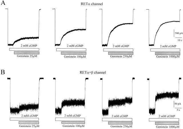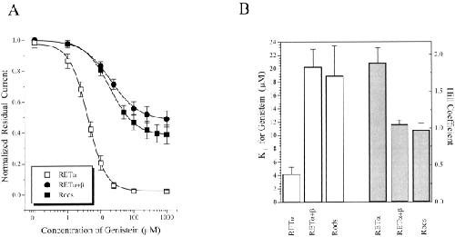 Figure 5. Subunit dependence of genistein inhibition of fully activated rod CNG channels. (A) Dose-inhibition curves for genistein effect on native and homomeric RETα, and heteromeric RETα+β channels. All channels were fully activated with saturating (2 mM) cGMP before genistein application. (B) Bar graph showing Ki and Hill coefficient values for genistein inhibition curves. Data represents mean ± SEM for all individual experiments included in A.