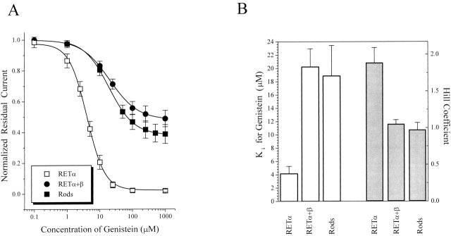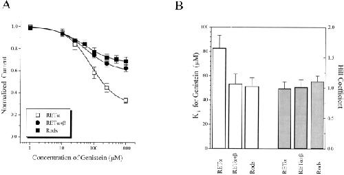Figure 4. Subunit dependence of genistein inhibition of closed rod CNG channels. (A) Dose-inhibition curves for genistein effect on closed native rod, homomeric RETα, and heteromeric RETα+β channels. (B) Bar graph showing Ki and Hill coefficient values for genistein inhibition curves. Data represents mean ± SEM for all individual experiments included in A.