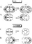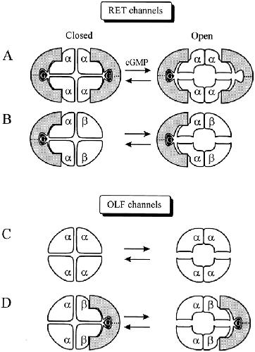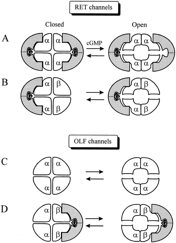Figure 9. Schematic diagram of genistein inhibition. Homomeric and heteromeric RET and OLF channels and their interactions with PTKs, symbolized with the shaded crescent symbol. Genistein (G) is depicted bound to the PTK. In the closed state of the homomeric RETα channel (A), two PTKs, and thus two genistein molecules, are required to completely inhibit the channel. cGMP triggers channel opening, which functionally dimerizes RETα subunits. With the PTK spanning two functional dimers, only one PTK, and therefore one genistein, is sufficient to inhibit the channel, although two are still able to bind. In addition, the affinity of the closed channel for the PTK is higher than for the open channel, hence a tighter fit between the channel and the PTK symbol is depicted for the closed channel. For the RETα+β channel (B), only the RETα binds the PTK. Hence there is no change in the number of PTK required to blocked the closed and open channels. The homomeric OLFα channel (C) is unaffected by genistein because OLFα subunits do not contain PTK binding sites. The heteromeric OLFα+OLFβ (D) channel binds one PTK, via the binding sites on the OLFβ subunits.