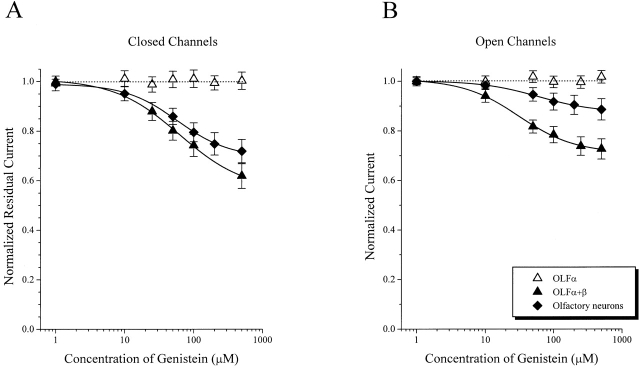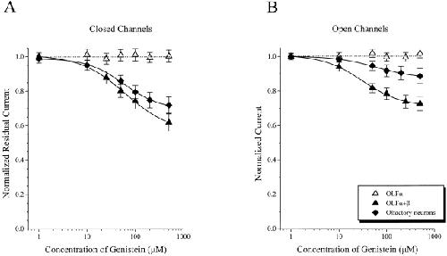 Figure 7. Subunit dependence of genistein inhibition of olfactory CNG channels. Dose-inhibition curves for genistein effect on closed (A) and fully activated (B) native (n = 3–5), homomeric OLFα (n = 4), and heteromeric OLFα+β (n = 6) channels.