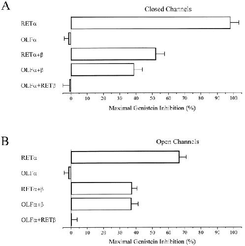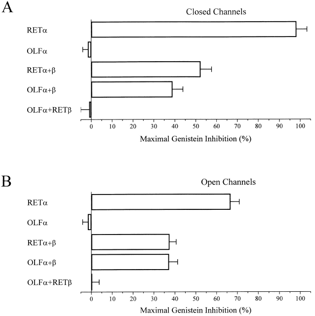Figure 8. Summary data for genistein inhibition of various expressed homomeric and heteromeric channels in closed (A) and fully activated (B) states. n = 5–8 for each channel type.