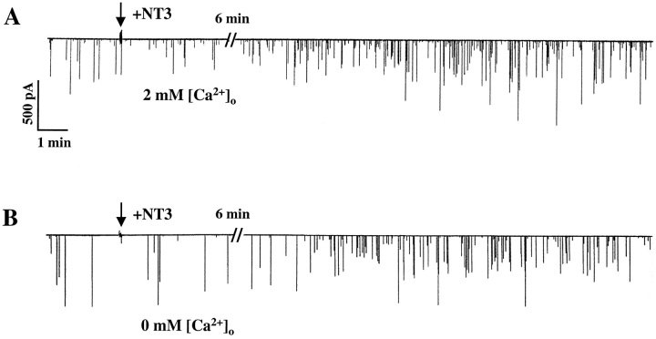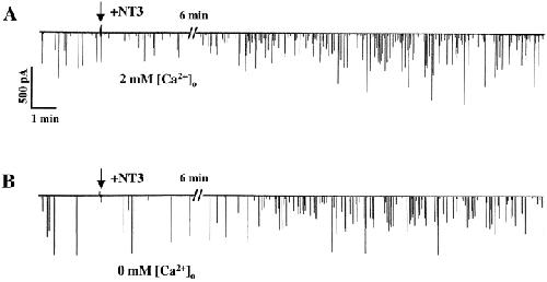 Figure 1. Acute potentiation of transmitter release at NMJ by NT3 is independent of extracellular Ca2+. (A) A sample recording showing that application of NT3 (50 ng/ml) rapidly increases the frequency of SSCs in the normal culture medium. (B) Application of NT3 also rapidly increases the frequency of SSCs in the Ca2+-free medium.