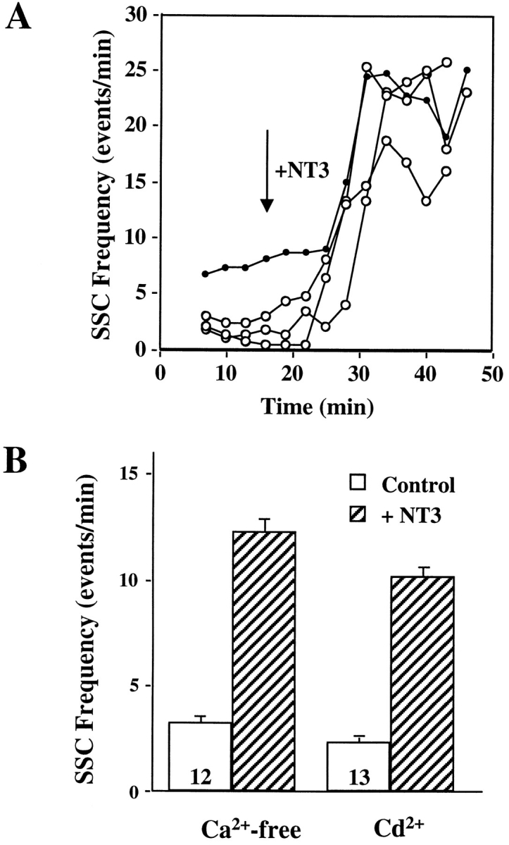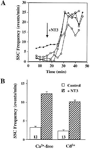 Figure 2. NT3-induced synaptic potentiation does not require Ca2+ influx. (A) Time courses of NT3 effect on spontaneous synaptic activity in zero external Ca2+ (open circles). The culture medium was replaced by Ca2+-free solution. The SSC frequency was monitored before and after NT3 application. Each point represents averaged SSC frequency in 3 min of recording. An example of recordings in normal medium (filled circles) is included for comparison. (B) The effect of NT3 on SSC frequency in Ca2+-free medium (n = 12) or in medium containing the Ca2+ channel blocker, Cd2+ (CdCl2, 0.4 mM, n = 13). For each synapse, a time course of SSC frequency was first constructed on a minute-to-minute basis. SSC frequencies are averaged from a 10-min recording right before NT3 application for controls, and a 10-min period starting from the highest number after NT3 application for NT3-treated groups. Error bars in this and all other figures are SEM. NT3 induced significant increases in SSC frequency in both conditions (P < 0.005, t test). Similar methods were used to calculate averaged SSC frequencies in all other figures, unless indicated otherwise.
