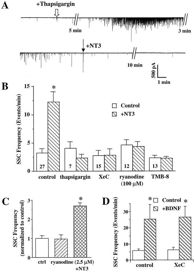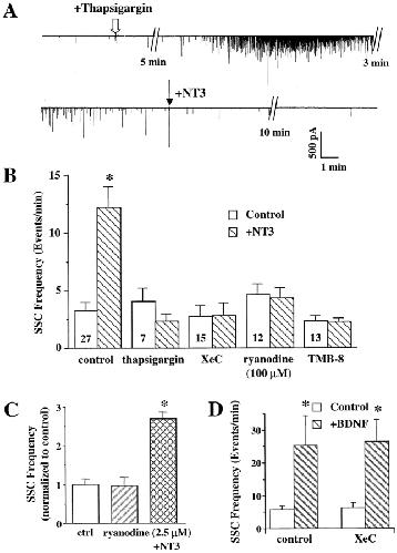 Figure 3. Enhancement of transmitter release by NT3, but not BDNF, requires Ca2+ release from intracellular Ca2+ stores. All experiments were carried out in Ca2+-free conditions, except that shown in D. The cultures were incubated with various drugs for 15–60 min, and SSCs were recorded continuously to monitor the effects of the drug and NT3 application. Thapsigargin was used to deplete Ca2+ from intracellular stores. Asterisk indicates data that are significantly different from the rest (P < 0.01, ANOVA test followed by post hoc comparison). (A) An example showing that thapsigargin (2 μM) prevents the NT3 effect. Application of thapsigargin (open arrow) elicited a transient but marked increase in SSC frequency due to the Ca2+ release from intracellular stores. Application of NT3 after SSC frequency returned to normal could no longer increase the SSC frequency. (B) Summary of the drug effects. Final concentration of the drugs in the culture media: thapsigargin, 2 μM; XeC, 1 μM; TMB-8, 30 μM; and ryanodine as an antagonist, 100 μM. The number of synapses recorded are indicated in the control bar of each pair. Asterisk indicates P < 0.005, t test. SSC frequencies are calculated in the same way as Fig. 2. (C) Summary of the effects of ryanodine as an agonist (2.5–5 μM). The SSC frequencies from a single synapse are counted for a 10-min period in control and a 10-min period after ryanodine application, and then a 10-min period after NT3 application. The data are then averaged and normalized to controls (n = 9). Note that ryanodine at the low concentration could not block the NT3 effect. (D) BDNF-induced synaptic potentiation is independent of Ca2+ release from intracellular stores through IP3 receptors. BDNF was applied to culture dishes in the presence (right, n = 5) or absence (left, n = 5) of the IP3 receptor inhibitor XeC (1 μM).