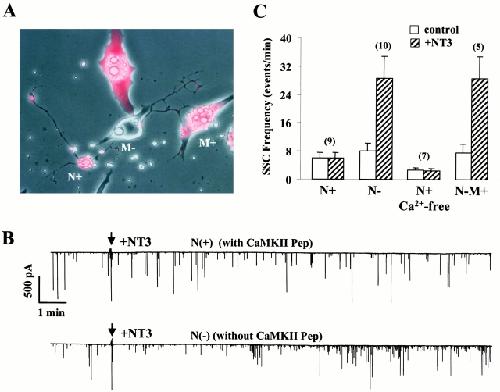 Figure 5. Inhibition of CaMKII prevents the effect of NT3. A peptide inhibitor for CaMKII (CaMKII-pep), together with rhodamine-dextran, was injected into Xenopus embryo at the two-cell stage, and the nerve–muscle co-cultures were prepared from the injected embryos. (A) Super-imposed phase and fluorescence micrographs of the 1-d-old nerve–muscle co-cultures showing cells loaded with (+) or without (−) CaMKII-pep. N, spinal neurons; M, myocytes. (B) A pair of recordings showing that loading of CaMKII peptide into presynaptic neurons N(+) prevented the NT3-induced increase in SSC frequency, whereas NT3 still enhanced transmitter release in a N(−) neuron in the same culture. (C) Summary of the effect of CaMKII-pep loaded into either presynaptic spinal neurons or postsynaptic myocytes. The number of synapses recorded are indicated above each pair of columns. In all N− conditions, application of NT3 elicited a significant increase in SSC frequency (P < 0.01, t test).