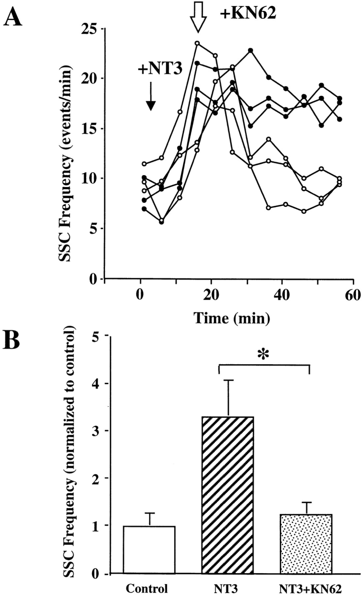 Figure 6. Reversal of NT3 effects by addition of KN62 after NT3 application. (A) Examples showing the time courses that KN62 reverses the NT3 effect. NT3 was first applied (filled arrow) to the culture medium to elicit an increase in the frequency of SSCs. After the SSC frequency reached the peak, KN62 (open arrow) was either applied (open circles) or not applied (filled circles), and synaptic currents were continuously monitored. (B) Summary of the reversal effect of KN62. SSC frequencies are calculated in the same way as Fig. 3 C. n = 5. Asterisk indicates P < 0.01, t test.