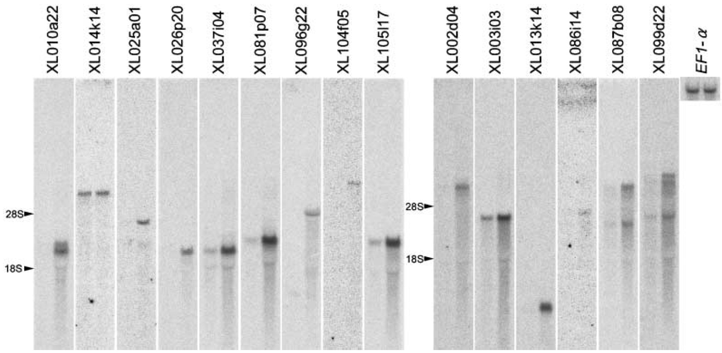 ribosomal RNA. XL087b08 and XL099d22 hybridized with transcripts of at least two different sizes. EF1-α was the internal control for