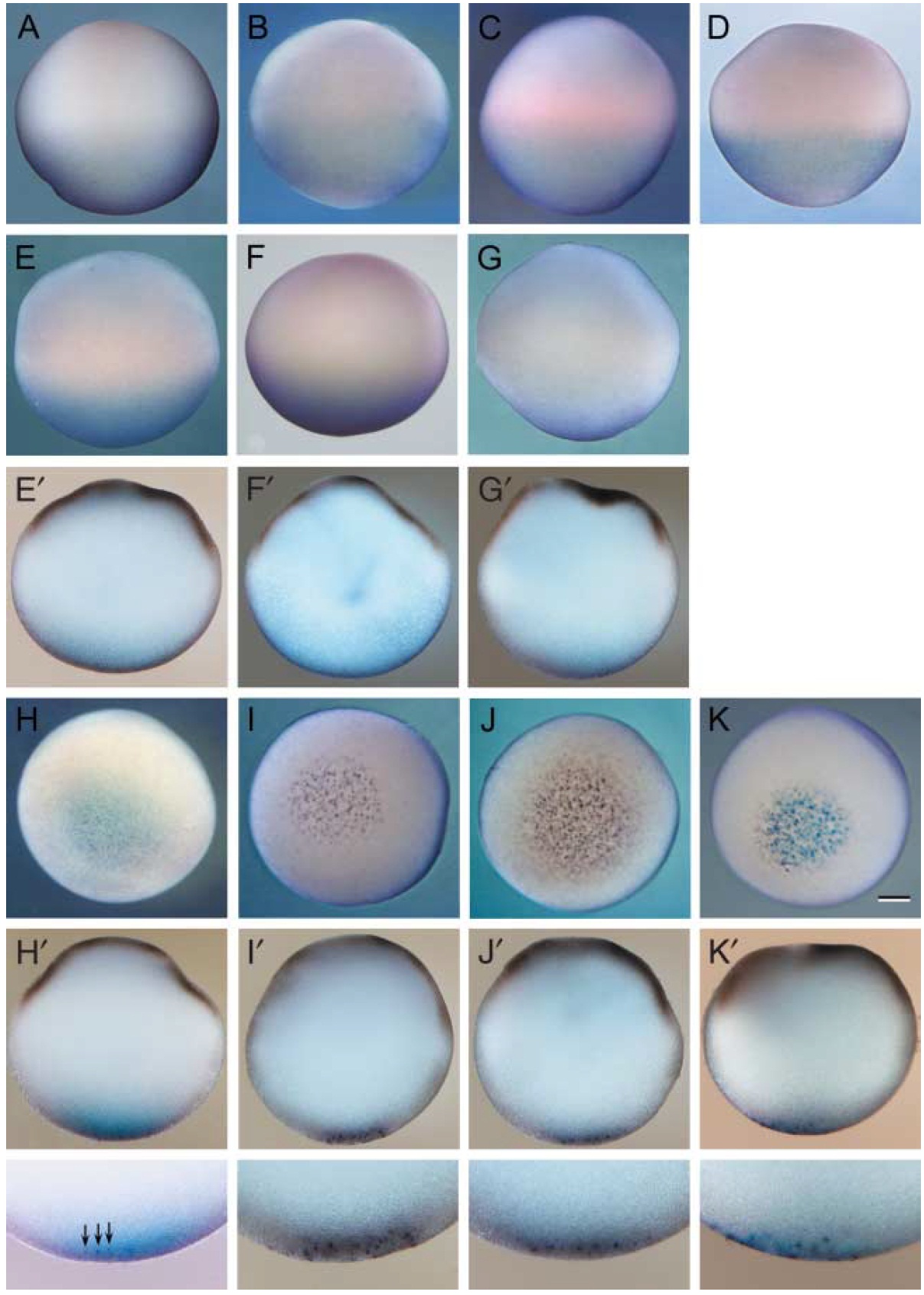 view. (Eâ²âKâ²) Cut face of the egg, which was bisected along animal-vegetal axis, with the pigmented animal pole on the top. Lowest panels