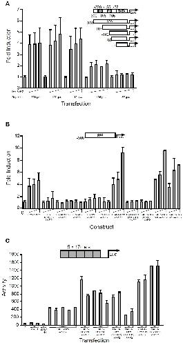 was co-transfected with the indicated reporters as in A. Bars