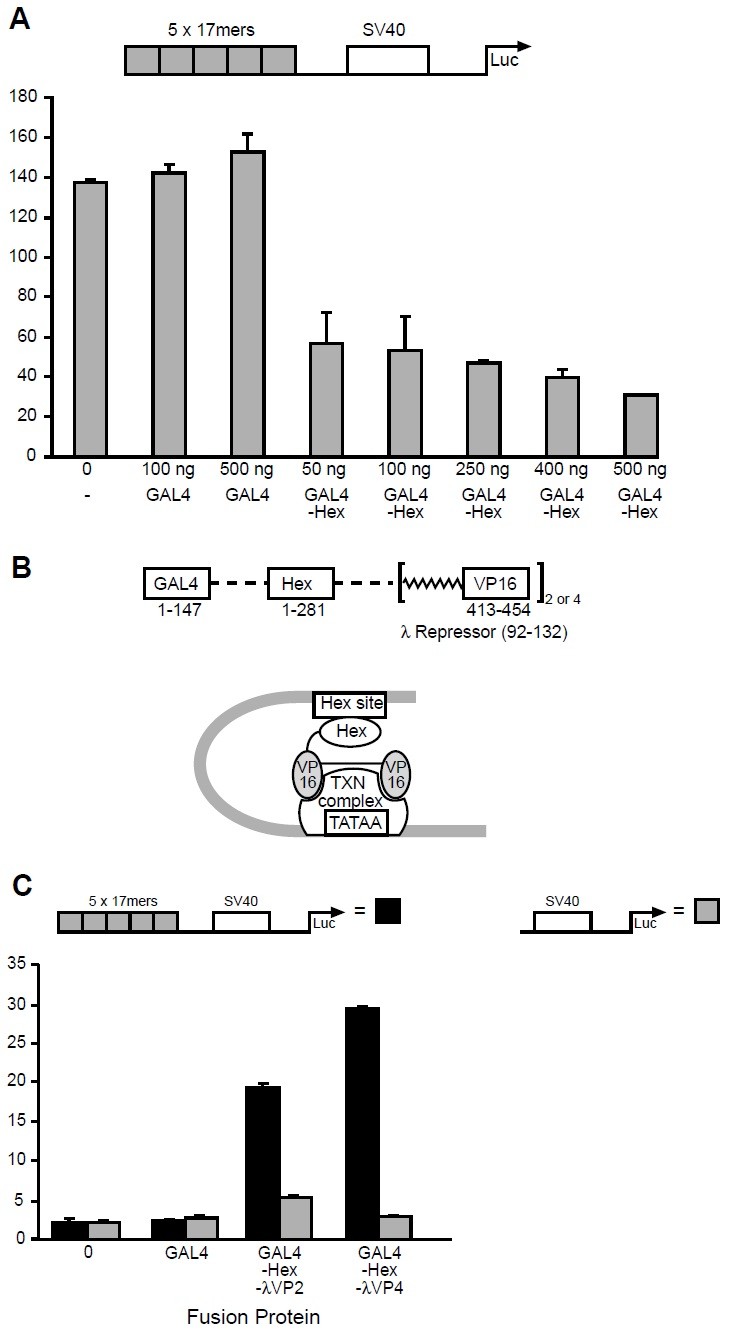 Hex represses transcription from upstream of the SV40 promoter.