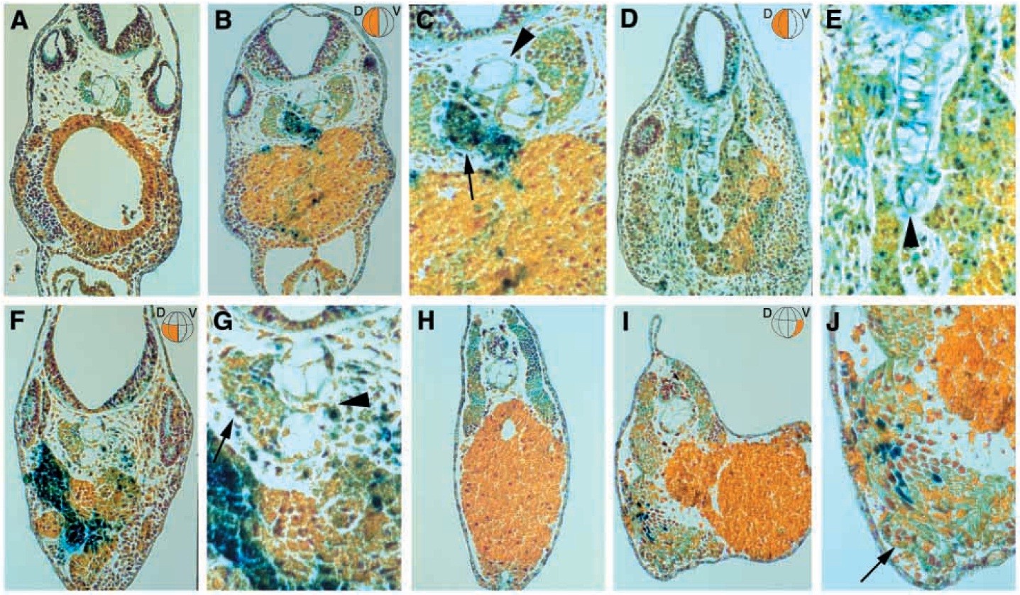 (A) Control embryo at the hindbrain level, (B-E) dorsal injections, (F-G) dorsal-vegetal injection, (H) control embryo, (I-J) ventral-vegetal