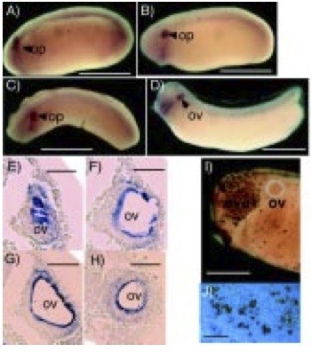 Fig. 3. Expression of xPAK1 in the otic placode and vesicle. Lateral views of whole-mount in situ hybridization of xPAK1 transcripts in X. laevis embryos at (A) stage 23/24, (B) stage 25, (C) stage 26, dorso-lateral view, (D) stage 29. (G-H) Sequential sections of a xPAK1 hybridized stage 29/30. (I) Whole-mount TUNEL staining [(Hensey and Gautier, 1998) as modified by Poitras et al. manuscript submitted] of anterior region of a stage 27 embryo. (J) Magnified view of TUNEL staining over the eye of a stage 27 embryo showing colocalization of stain with cell nuclei, as revealed by Hoechst 33258 fluorescence. Op, otic placode; ov, otic vesicle. Bar in A to D, 1 mm; in E to H, 50 μm; in I 0.5 mm; and in J 100 μm.