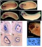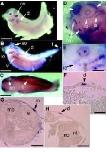 Fig. 4. Expression of xPAK during lateral line development. (A) Stage 35/36, (B-H) stage 37/38. (A-E) Whole-mount in situ hybridization. (F,G and H) Transverse sections of stage 37/38 whole mount embryos sectioned after hybridization with xPAK1. ov, otic vesicle; o, olefactory placode; nc, notochord; e, eye; a, d, io, so, hm, respectively the aortic, dorsal, infraor- bital, supraorbital and hyomandibular lateral lines; t, tail. Bar in A to C,1 mm; in D, 0.3 mm; in E and F, 0.16 mm; and in G and H, 0.3 mm.