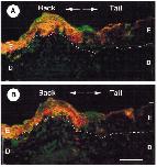 epidermal cells. Note the clear immunohistochemical difference between the back and the tail areas of the epidermis. Broken lines show the