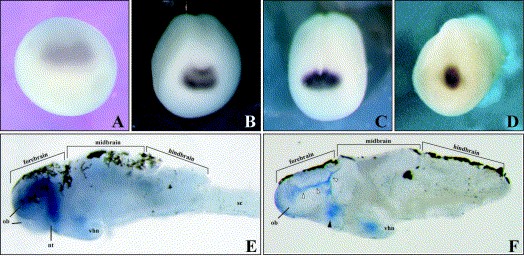 Fig. 2. Fez expression pattern in Xenopus embryos and tadpolebrain. (AâD) Anterior views (top is dorsal) of embryos at stage 12 (A), stage 13/14 (B), stage 16/17 (C), and stage 24 (D). The signal intensifies during development and remains localized to the telencephalic region. (E) A lateral view of Xenopus brain at stage 45, showing the approximate boundaries of the forebrain, midbrain, and hindbrain. A strong expression is detected in the forebrain. (F) A saggital section of the Xenopus brain at the same stage, displaying expression in the olfactory bulbs, nervus terminalis (black arrowhead) and ventricular zone (white arrowheads). A faint expression is visible near the ventral hypothalamic nucleus. Brown fiber-like processes at the top of the brain in (E,F) are epidermal pigments. Abbreviations: nt, nervus terminalis; ob, olfactory bulb; sp, spinal cord; vhn, ventral hypothalamic nucleus.