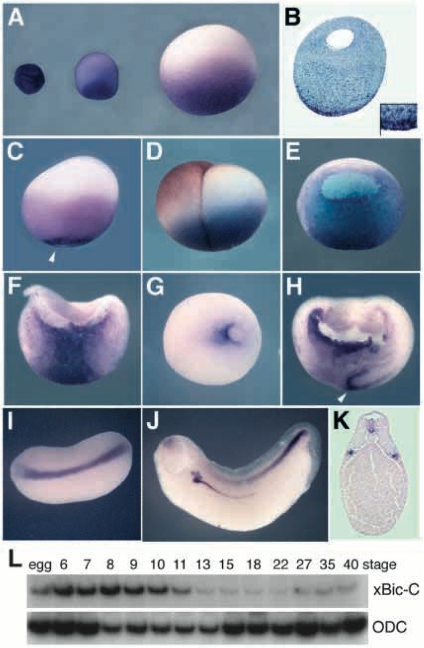 Fig. 3. Expression analysis of x-Bic-C. (A-K) Localization of xBic-C mRNA analyzed by in situ hybridization. (A) Albino oocytes at stages II, III and V. (B) In situ hybridization of a stage V oocyte section, inset shows a magnification of the punctate staining in the oocyte vegetal cortex. Low levels of xBic-C transcripts are found in the animal cytoplasm, but not in the germinal vesicle nucleus. (C) Double in situ hybridization showing vegetal expression of xBic- C and of the germ plasm marker Xcat-2 (Forristall et al., 1995); the arrowhead indicates Xcat-2. Although both genes are localized to the vegetal pole, their distribution is clearly different. (D) Regularly cleaving embryos with a strong dorsoventral polarity at the 4-cell stage. Note the dorsal (light blastomeres) displacement of xBic-C mRNA upon cortical rotation. (E,F) Hemisections of stage 8 and 10.5 embryos on a plane perpendicular to the dorsoventral axis. (G,H) Stage 12 hybridized as a whole mount and as a hemisection; note zygotic expression in the dorsal lip (arrowhead). (I) Stage 24, dorsal view; (J) stage 30, lateral view; staining is seen in the pronephros, the pronephric duct and the posterior spinal cord. (K) Transverse section of a stage 30 embryo showing the staining in the pronephros anlage as well as in the floorplate. (L) RT-PCR analysis of the expression of xBic-C at different developmental stages using ODC as loading control. |