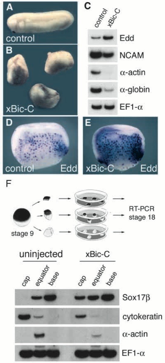 Fig. 5. Overexpression of xBic-C mRNA leads to excessive endoderm formation. Synthetic RNA for xBic-C (160 pg) was injected marginally into each of the 4 blastomeres of 4-cell-stage embryos. (A,B) Phenotypic appearance at stage 26; injected embryos did not undergo proper gastrulation movements. (C) RT-PCR analysis of similar embryos at stage 26 showed elevated levels of endodermin (Edd) expression, but a decrease in the mesodermal markers α-actin and α-globin. NCAM was less decreased. (D,E) In situ hybridization of Edd on hemisections of embryos injected as described above and harvested at stage 10.5. (F) Control and xBic-C- injected embryos were dissected at blastula stage (stage 9) into animal cap, equatorial and vegetal region. Explants were kept in culture until sibling embryos reached stage 18 and then analyzed by RT-PCR using Sox17β as a marker for endoderm, cytokeratin for epidermis and α-actin for mesoderm. Note that upon overexpression of xBic-C the endodermal germ layer extends into the animal cap. EF1α indicates equal loading of RNA. |