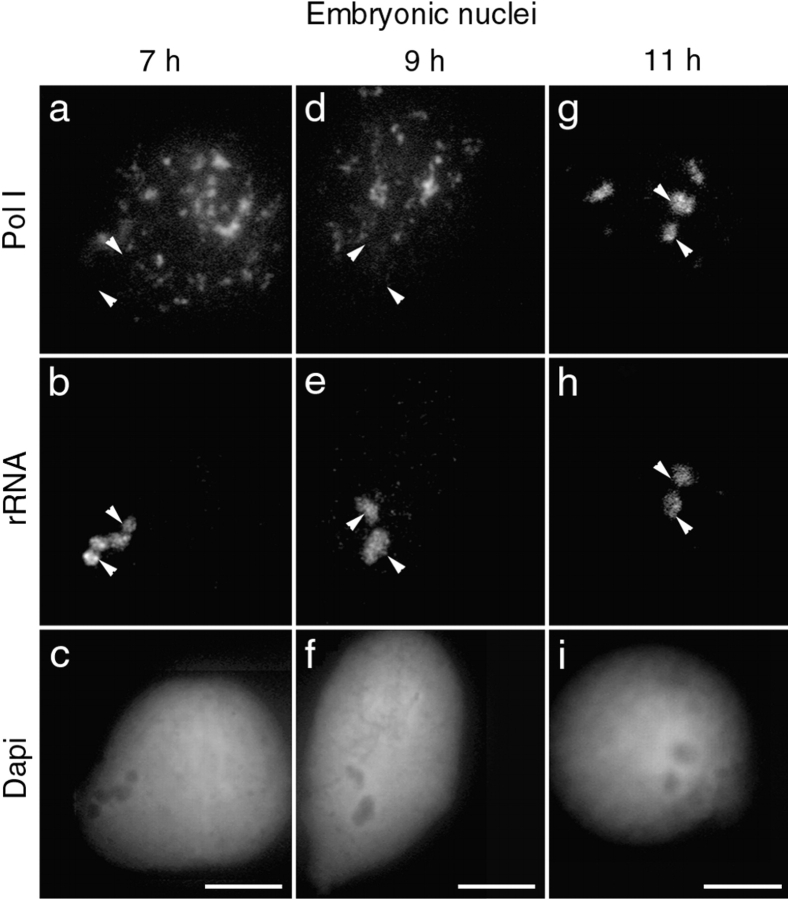 Transcription and splicing of messenger RNAs are temporally and spatially coordinated through the recruitment by RNA polymerase II of processing factors. We questioned whether RNA polymerase I plays a role in the recruitment of the ribosomal RNA (rRNA) processing machinery. During Xenopus laevis embryogenesis, recruitment of the rRNA processing machinery to the nucleolar domain occurs in two steps: two types of precursor structures called prenucleolar bodies (PNBs) form independently throughout the nucleoplasm; and components of PNBs I (fibrillarin, nucleolin, and the U3 and U8 small nucleolar RNAs) fuse to the nucleolar domain before components of PNBs II (B23/NO38). This fusion process is independent of RNA polymerase I activity, as shown by actinomycin D treatment of embryos and by the lack of detectable RNA polymerase I at ribosomal gene loci during fusion. Instead, this process is concomitant with the targeting of maternally derived pre-rRNAs to the nucleolar domain. Absence of fusion was correlated with absence of these pre-rRNAs in nuclei where RNA polymerase II and III are inhibited. Therefore, during X. laevis embryogenesis, the recruitment of the rRNA processing machinery to the nucleolar domain could be dependent on the presence of pre-rRNAs, but is independent of either zygotic RNA polymerase I transcription or the presence of RNA polymerase I itself.