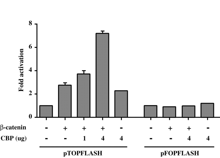 Figure 2. CBP synergizes with β-catenin to activate transcription. HeLa cells were transiently transfected with 1 μg of pTOPFLASH or pFOPFLASH reporter, indicated amounts of CBP expression plasmid, either with or without 1 μg of pt β-cateninâencoding plasmid. Transfections were carried out in triplicate and the means ± SD are shown. Where they are not evident, this is due to minimal variability between transfections.