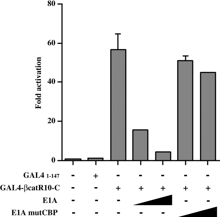 Figure 4. Endogenous CBP is required for transactivation by GAL4-βcatR10-C fusion protein. HeLa cells were transfected with 1 μg of GAL4 reporter construct, pFR-Luc, 50 ng of GAL4 1–147 or GAL4-βcatR10-C, and increasing amounts of E1A or E1A mutCBP expression plasmid (25 or 500 ng) in combinations as indicated.