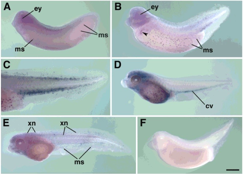 Fig. 2. Embryonic expression patterns of Xenopus gelatinase B (Xmmp-9), revealed by digoxygenin-labeled RNA in situ hybridization. A: Lateral view of a stage 26 embryo showing the first detectable Xmmp-9 expression in scattered mesenchymal cells. B: Increased expression in a stage 37 embryo (black arrowhead points to expression associated with the developing liver diverticulum ). C: High magnification view of the tail of a stage 40 larva. D: Stage 42 larvae showing continued expression in the abdominal region and the tail. Faint staining in the head and in the olfactory epithelium is an artifact, which is sometimes seen in sense RNA controls. E: Stage 46 embryo showing decreased expression of Xmmp-9. A small number of pigmented xanthophores (xn), in the head, dorsal tail, and peritoneum normally appear in albino larvae at this stage, which are not expressing Xmmp-9. F: Negative control stage 38 embryo reveals no appreciable hybridization of sense RNA. All specimens are shown as lateral views with the anterior ends located to the left. cv, caudal veins; ey, eye; ms, mesenchyme cells. Scale bar =500 um in A,B and D and 250uminC.