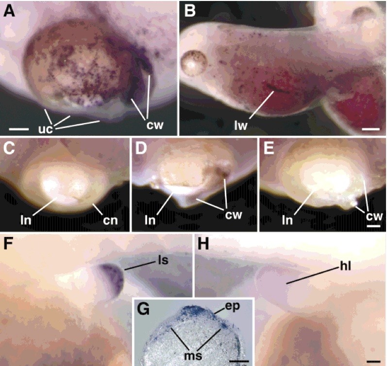 Fig. 5. Expression of Xmmp-9 mRNA associated with corneal wound healing, in various epithelial wounds, and during the earliest stage of limb regeneration following amputation. A: Left superolateral view 24 hr after lens removal. Expression is restricted to the posterior corneal wound. Pigmented spots on the surface of the eye are xanthophores, which normally develop even in many albino embryos. B: Leftlateral view showing expression associated with a lateral epithelial wound 24 hr after surgery in a young stage 41 larva. C: Absence of expression in the unoperated control eye of a stage 52 tadpolelarva. D: Expression of Xmmp-9 in sham operated specimens 24 hr after incision of the outer corneaepithelium. E: Negative control with no detectable hybridization of sense RNA probe to the wounded cornea 24 hr after incision of the outer corneal epithelium. F: Xmmp-9 expression in the lefthindlimb stump 24 hr after distal amputation in a stage 52 tadpolelarva. G: Longitudinal section of an amputated stage 52 limb 6 hr after amputation. Xmmp-9 mRNA is present in the apical ectodermal cap (ep) and the underlying mesoderm (ms). H: Absence of expression in the hindlimb on the unop- erated side. cn, cornea; cw, corneal wound; hl, unoperated hindlimb; ln, lens; ls, hindlimb stump; lw, lateral ectodermal wound; uc, uninjured cornea overlying the central pupillary space. Scale bar =500 um in A, 200 um in B. Scale bar in E applies to C and D and equals 100um. Scale bar in G 50um.Scale bar in H applies to F and equals 100um.