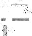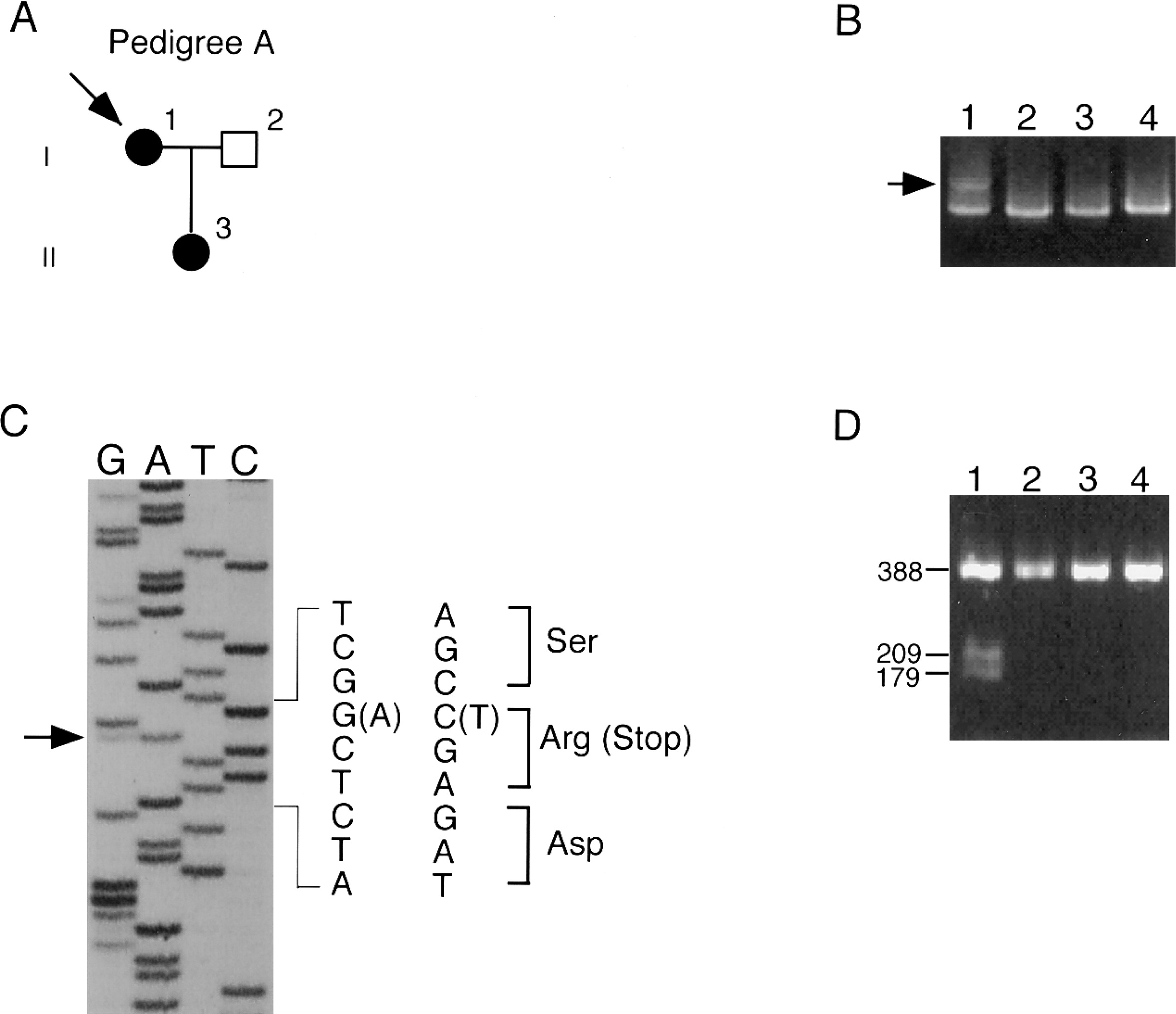 Figure 2 R482X mutation in a family with JME. A, Affected individuals (blackened symbols) are shown, with the arrow pointing to the proband. B, Results of CSGE of exon 13. A unique band seen in the proband (lane 1, arrow) is not observed in three unrelated controls (lanes 2–4). C, The sequence of exon 13 demonstrates that the proband is heterozygous for a C→T transition that generates the premature-termination codon R482X. D, Results of a restriction-site assay for R482X. A 388-bp fragment obtained by digestion of wild-type exon 13 with AluI is shown (lanes 2–4). The internal AluI site produced by R482X results in two fragments (209 bp and 179 bp; see lane 1).