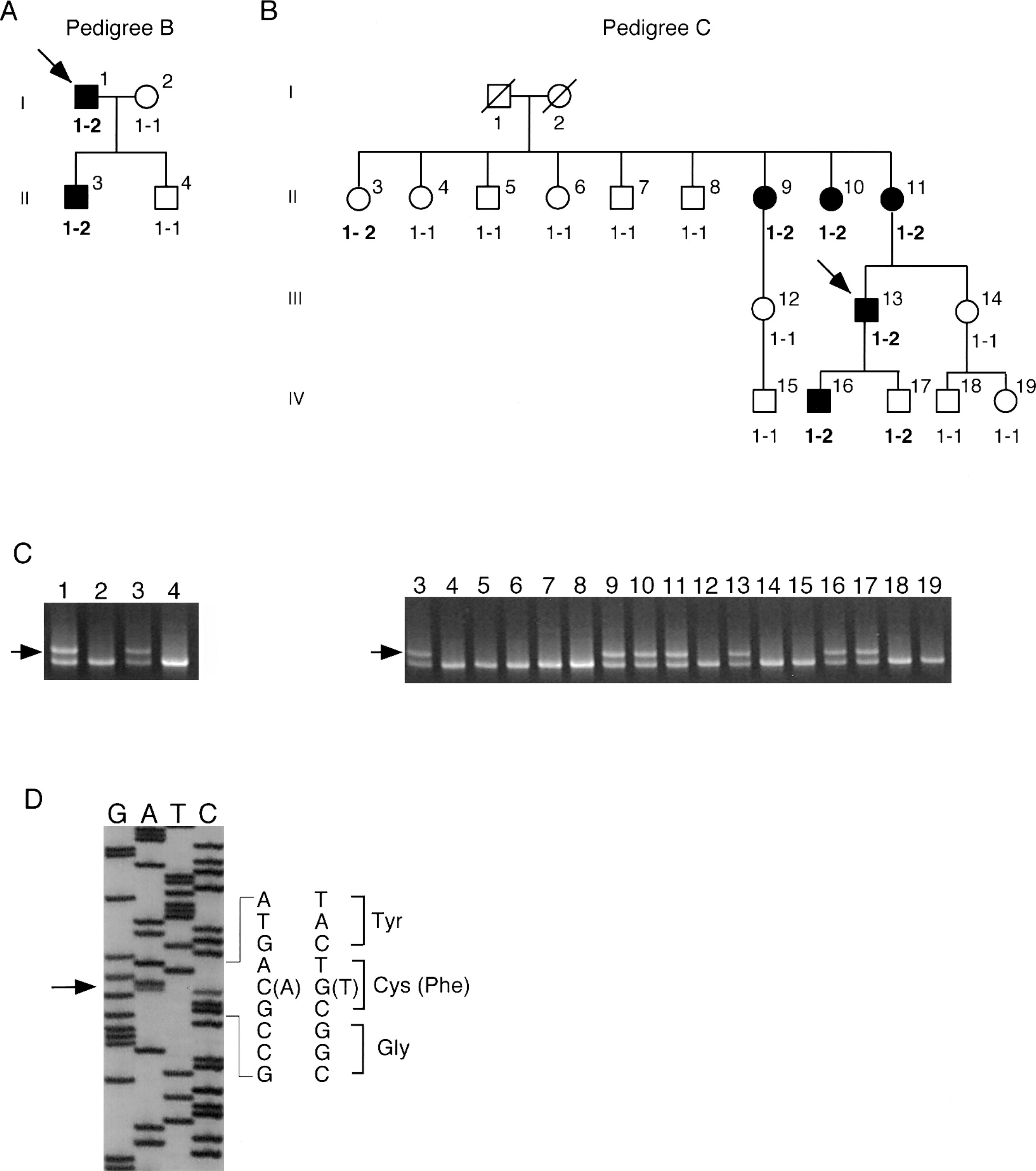 Figure 3 C104F mutation cosegregating with neurological disease in two unrelated pedigrees. A, Pedigree B, which is of German origin and exhibits idiopathic generalized epilepsy. B, Pedigree C, which is of French Canadian origin and exhibits episodic ataxia. C, CSGE analysis of exon 3 from pedigree B (left) and from pedigree C (right). The variant conformer is indicated (arrow). Numbers above the lanes correspond to individuals in the pedigrees. D, Sequence of exon 3 that demonstrates a G→T transversion that changes the wild-type cysteine 104 codon to phenylalanine. CACNB4 genotypes are indicated below the symbols. G = allele 1; T = allele 2.