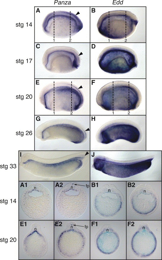 Fig. 2. Embryonic expression of Panza and Edd. Whole-mount in situ hybridization for Panza (A,A1,A2,C,E,E1,E2,G,I) and Edd (B,B1,B2,D,F,F1,F2,H,J) at stages 14 (A,A1,A2,B,B1,B2), 17 (C,D), 20 (E,E1,E2,F,F1,F2), 26 (G,H), and 33 (I,J). Panza expression is first detected at the neurula stage in the dorsal primitive gut (archenteron roof) extending from the oral evagination to the blastopore, with expression extending more laterally in the posteriorgut. With elongation of the body axis, Panza extends along the entire anteriorâposterior axis in the dorsal gutendoderm, narrower in the anteriorgut and gradually broadening in the posteriorgut. Panza is also expressed in the chordaneural hinge, extending into the floorplate of the posterior neural tube (arrowheads). Edd is expressed throughout the dorsal, lateral and ventralendoderm, but not in the neural tube. (AâJ) Lateral views of cleared embryos with anteriorleft are shown. (A1âF2) Transverse sections (dorsal up) of stained embryos at the axial levels indicated by dotted lines in (A,B,E,F). fp, Floorplate; n, notochord.