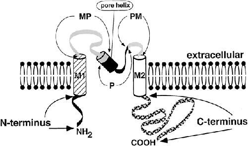 Figure 1. Segmental division of both ROMK and IRK. In each of the four subunits, M1 and M2 are presumed membrane-spanning domains. P denotes the highly conserved (pore) domain. The segments MP and PM are, respectively, the region between M1 and P, and the region between P and M2. The cylinder in the extracellular loop is the pore helix (Doyle et al. 1998), consisting of the first half of the P region with a minor contribution from the MP region. The seven segments of the chimeras are defined in Figure 4 of Choe et al. 1999. |
