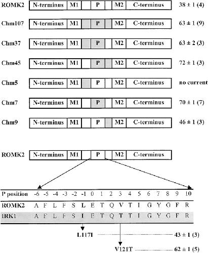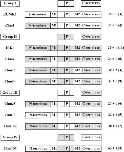 Figure 3. Conductance (pS) at the voltage range of 0–100 mV. Shaded rectangles correspond to segments from IRK1. Clear rectangles denote segments from ROMK2. Data are means ± SEM (number of measurements). |