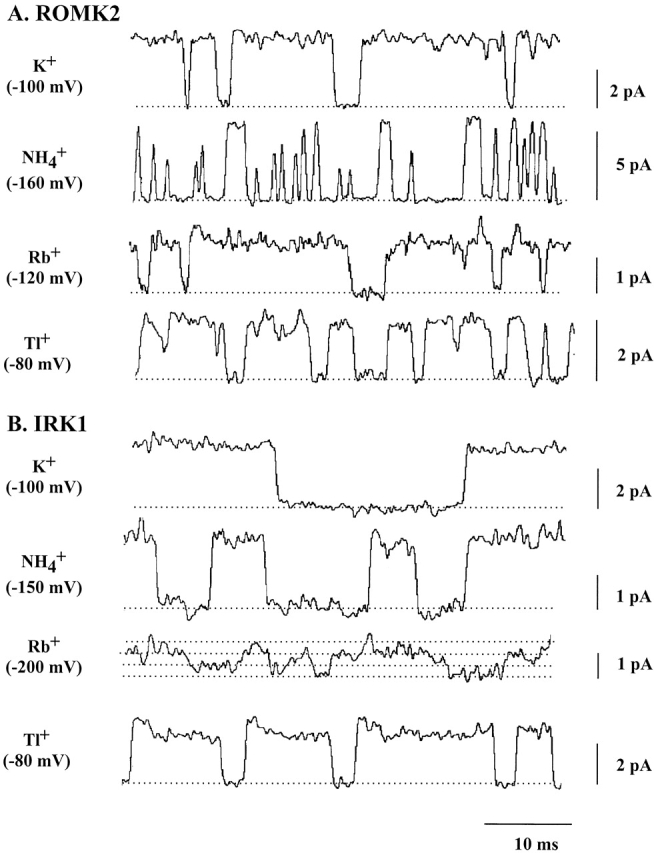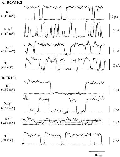 Figure 5. Single-channel current traces of ROMK2 and IRK1 with K+, NH4+, Rb+, and Tl+ in the pipettes (110 mM) in the cell-attached mode. The dotted lines indicate the closed state, and upward deflections denote inward current. The voltages in parentheses indicate the membrane potentials. The Rb+ currents for IRK1 were recorded from patches with multiple channels. |