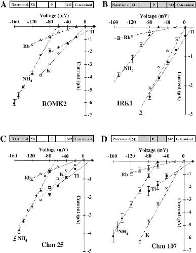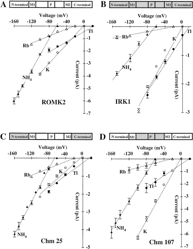Figure 6. I-V plots for single channel inward currents of ROMK2, IRK1, Chm25, and Chm107 in the cell-attached mode. Data points and error bars for the four cations in the pipette represent means ± SEM as follows: K+ (○), NH4+ (▴), Rb+ (▵), and Tl+ (•). The dashed lines are averages of linear regressions of individual patches over the following ranges: 0 to −100 mV (K+), −60 to −160 mV (NH4+), −20 to −120 mV (Rb+ for ROMK2), −20 to −200 mV (Rb+ for IRK1), and 20 to −80 mV (Tl+). The correlation coefficients are (in the order of K, NH4, Rb, and Tl): for ROMK2: 0.997, 0.998, 0.989, and 0.991; for IRK1: 0.989, 0.988, 0.996, and 0.993; for Chm25: 0.987, 0.999, 0.987, and 0.984; for Chm107: 0.996, 0.999, 0.993, and 0.993. |