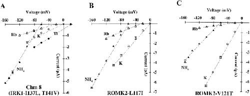 Figure 7. I-V plots for single channel inward currents of Chm8 (ROMK2, L117I, and V121T) and the individual mutants, L117I and V121T, in the cell-attached mode. The symbols and the voltage range for the conductance estimates are the same as in Fig. 6. The correlation coefficients are (in the order of K, NH4, and Rb): for Chm8: 0.994, 0.993, and 0.991; for L117I: 0.997, 0.998, and 0.991; for V121T: 0.997, 0.996, and 0.994. |