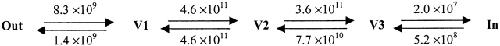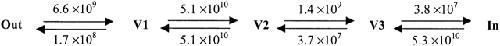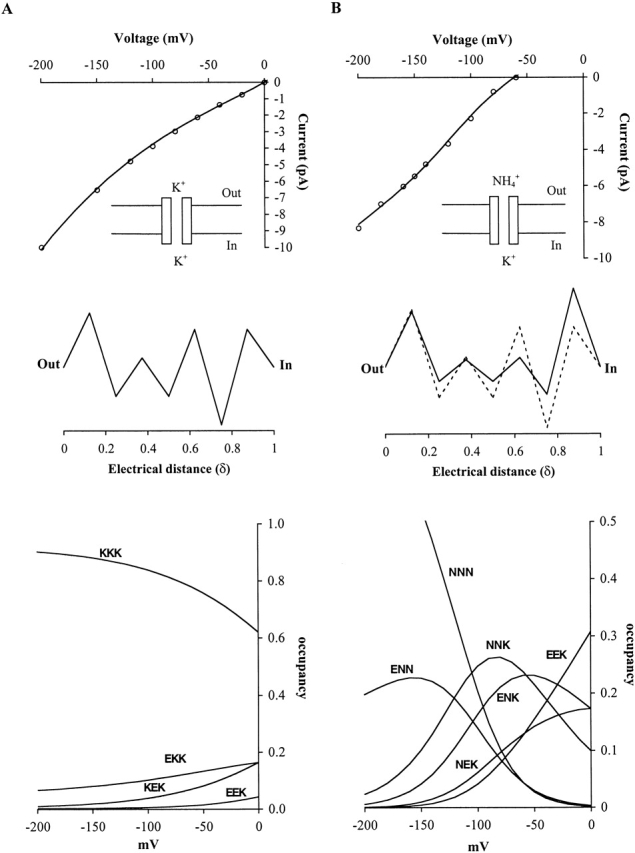 Figure 9. Three-site four-barrier kinetic model. (A, top) Single channel I-V plots for K+ current through ROMK2 channel (110 mM KCl in the pipette in the cell-attached mode). The line is the best-fit to the data using the three-site four-barrier kinetic model, which gives rise to the following rate constants (s−1) (Scheme I). V1, V2, and V3 represent the first, second, and third energy wells from the outside.SCHEME I (Middle) The energy profile for K+ ion along the pore of ROMK2 at 0 mV. The shape of the energy profiles was constructed from the kinetic model. (Bottom) Occupancy plot of each state as a function of voltage for the K+ ion in the pore of ROMK2. The symbol KKK indicates the state that all three energy wells are occupied by K+, and the symbol EKK indicates the state that the second and the third energy wells from outside are occupied by K+. The pore is occupied by at least two K+ ions most of the time. The occupancies of the two states, KKE and EEE, are very small and not shown. (B, top) Single channel I-V plots of ROMK2 with NH4+ (110 mM) outside and K+ (110 mM) inside the cell. The line is the best-fit to the data using the three-site four-barrier kinetic model with the same rate constants as in A for K+. The fitting procedure produced the following kinetic rates for NH4+ (Scheme II).SCHEME II (Middle) The ion energy profile (solid) for NH4+ ion along the pore of ROMK2 at 0 mV, obtained from the kinetic model for NH4+. The dotted energy profile is for K+ in A for comparison. The energy wells for NH4+ are shallower than those for K+, suggesting weaker affinity for NH4+. (Bottom) Occupancy plot of each state as a function of voltage in the pore of ROMK2 with NH4+ outside and K+ inside. The symbol NNN means that all three sites are occupied by NH4+, and the symbol NEK means that the outer and inner wells are occupied by NH4+ and K+, respectively. States with small occupancies are not shown for clarity. |