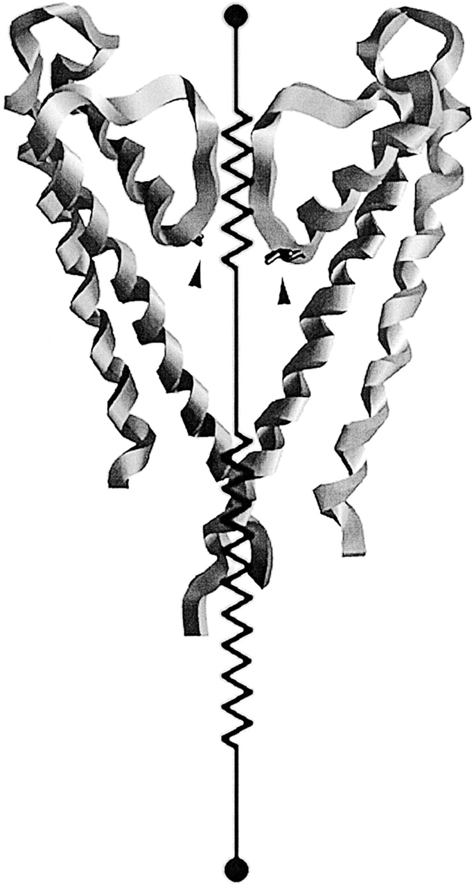 Figure 8. The 3P position in the crystal structure of the KcsA channel (arrows) is located at the COOH terminus of the pore helix. The 3P residue in KcsA and IRK is Thr; in ROMK it is Val. The KcsA ribbon model was constructed from coordinates downloaded from the PDB database, structure 1BL8. Two of the four subunits are shown for clarity. The symbol for two resistors is superimposed on the channel structure. Note that the model assumes a long cytoplasmic inner resistor that is not observed in the channel structure. |