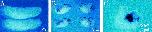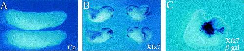 Fig. 3. Overexpression of Xfz7 perturbs trunk and tail formation. (A) Normal uninjected tadpoles (NF-stage 35). (B) Embryos injected unilaterally with 0.2 ng of Xfz7 mRNA in the lateral marginal zone at the eight-cell stage, display reduced tail structures and kinked trunks (45%, n=15/33). (C) In embryos injected bilaterally at the four-cell stage in the dorsal marginal zone with 0.5 ng of Xfz7 mRNA and 0.1 ng of β-gal mRNA as a lineage tracer, the injected cells are not distributed along the axis but stay together as a clump (80%, n=44/55).