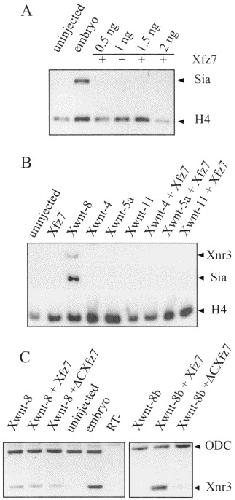 Fig. 7. Interaction of Xfz7 with Wnt-1 and Wnt-5a-type ligands. (A) Increasing amounts of Xfz7 mRNA (0.5â2 ng) were injected into animal blastomeres. Animal caps were explanted at stage 8.5 and cultured until stage 10. Expression of the dorsal marker siamois was assayed by RTâPCR. (B) Synthetic Xwnt-5a type-ligands (0.02 ng) (Xwnt-4, Xwnt-5 and Xwnt-11 mRNAs) alone or in combination with 0.5 ng of Xfz7 mRNA were injected into two animal blastomeres. Animal caps were explanted at stage 8.5 and cultured until stage 10 and expression of sia and Xnr-3 was analyzed by RTâPCR. Xwnt-8 mRNA (0.02 ng) alone but not Xwnt-5a-type ligands in combination with Xfz7 induced Xnr-3 and sia expression. (C) Xwnt-8b acts synergistically with Xfz7 to trigger the Wnt-1 pathway. Synthetic Xwnt-8 mRNA (0.02 ng), Xwnt-8b mRNA (0.02â0.1 ng) alone or in combination with 0.5 ng of Xfz7 or 0.5 ng of δCXfz7 mRNAs were microinjected into two animal blastomeres at the four-cell stage. Animal explants were dissected and analyzed for Xnr-3 expression by RTâPCR.