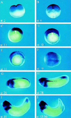 Fig. 2. Localization of Xfz7 mRNA in Xenopus embryos. Whole-mount in situ hybridization for Xfz7. Maternal Xfz7 transcripts are localized in the animal region of two-cell (A) and eight-cell embryos (B). A and B show horizontal sections through the embryo. Zygotic Xfz7 is detectable at early gastrula stages on the dorsal side, stages 10, 10.5, vegetal view (C,D). The arrows show staining at the dorsal lip. (E) Stage 11, mid-gastrula, dorsal is on top. The Xfz7 expression domain extends to form a ring around the closing blastopore. (F) Stage 19, neurula, dorsal view. Xfz7 expression is seen at dorsal and anterior positions. (G,H,I) In tailbud stages (26, 28 and 31), Xfz7 is expressed preferentially in the head region, the pronephros and the tailbud. (J) In stage 35/36 tadpoles, no Xfz7 expression can be detected in the pronephros and tail, whereas the expression in the head persists.