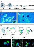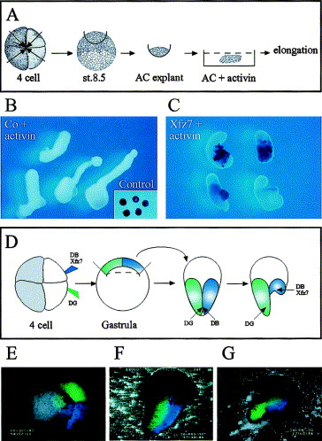 Fig. 5. Overexpression of Xfz7 affects morphogenetic movements in animal caps and dorsal lip explants. (A) Experimental scheme. Embryos were coinjected at the four-cell stage with 0.5 ng of Xfz7 and 0.1 ng of β-gal mRNA as a lineage tracer. Animal caps were dissected at stage 8.5 and in the presence of activin protein and analyzed for elongation at stage 17. (B) Animal cap control explants from uninjected embryos treated with activin (elongation in 95%, n=18). The small panel shows uninduced explants. (C) In animal cap explants overexpressing Xfz7 and β-gal and stimulated with activin, elongation is inhibited (82%, n=62). (D) Pigmented embryos were microinjected at the four-cell stage in the left dorsal marginal zone with 0.25 ng of dextran fluorescein fluoro-emerald (DG) and 0.5 ng of Xfz7 mRNA with 0.5 ng of dextran blue (DB) was injected in the right dorsal marginal zone. The embryos were cultured until stage 10.5 and dorsal explants were microdissected and cultured for 5â7 h. (E) Stage 10.5, vegetal view. Distribution of the fluorescent markers (DG and DB) in the blastopore lip before explantation. (F) Open-faced dorsal explant from a control embryo injected on the right side with DB and on the left side with DG. (G) Open-faced dorsal explant from embryo injected on the right side with Xfz7 mRNA plus DB and DG on the left side. Elongation was inhibited on the side that received the Xfz7 mRNA.