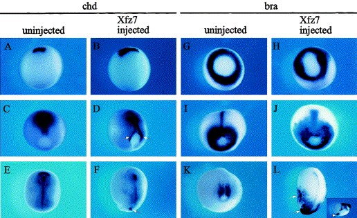Fig. 4. Xfz7 changes the pattern of chordin and Xbra. Albino embryos at the four-cell stage were injected in the marginal region of all blastomeres with 0.5 ng of Xfz7 mRNA. (A,C,E) Expression of chd in uninjected and (B,D,F) Xfz7-injected embryos was examined at stage 10.5, 12 and 18 by whole-mount in situ hybridization. The early pattern of chd is unchanged in injected embryos (A,B). Toward the end of gastrulation, chd-positive cells do not converge to the dorsal midline (C,D) and stay at the site of the closing blastopore (E,F), indicated by arrows. (G,I,K) Expression of Xbra in uninjected and (H,J,L) Xfz7-injected embryos was examined at stage 10.5, 12 and 18. (L) Small inserted picture. Note the ectopic Xbra expression in Xfz7-injected embryos on ventral and lateral sides (arrows).