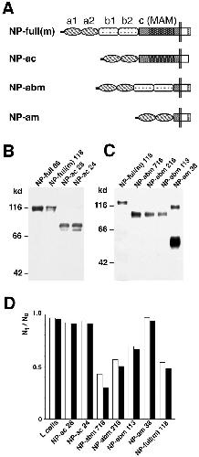 Figure 2. Cell adhesion activity of transfectants which express mutant neuropilin-1 proteins (Part 2). (A) A schematic representation of mutant neuropilin-1s; NP-full(m), full-length neuropilin-1 containing myc tag at the COOH-terminal end; NP-ac, neuropilin-1 lacking the b1 and b2 domains; NP-abm, neuropilin-1 lacking the c domain (myc-tagged); NP-am, neuropilin-1 lacking the b1, b2, and c domains (myc-tagged). (B and C) Immunoblot of the transfectants with the antibody raised against the b1-c domains (B) and anti-myc antibody (C). The number followed by the name of the construct represents the clone number. A band at the 100-kD position in the lane of NP-am appears to be dimerized proteins. (D) Quantification of cell aggregation activity of the mutant neuropilin-1s. White and black bars represent N30/N0 and N60/N0, respectively.
